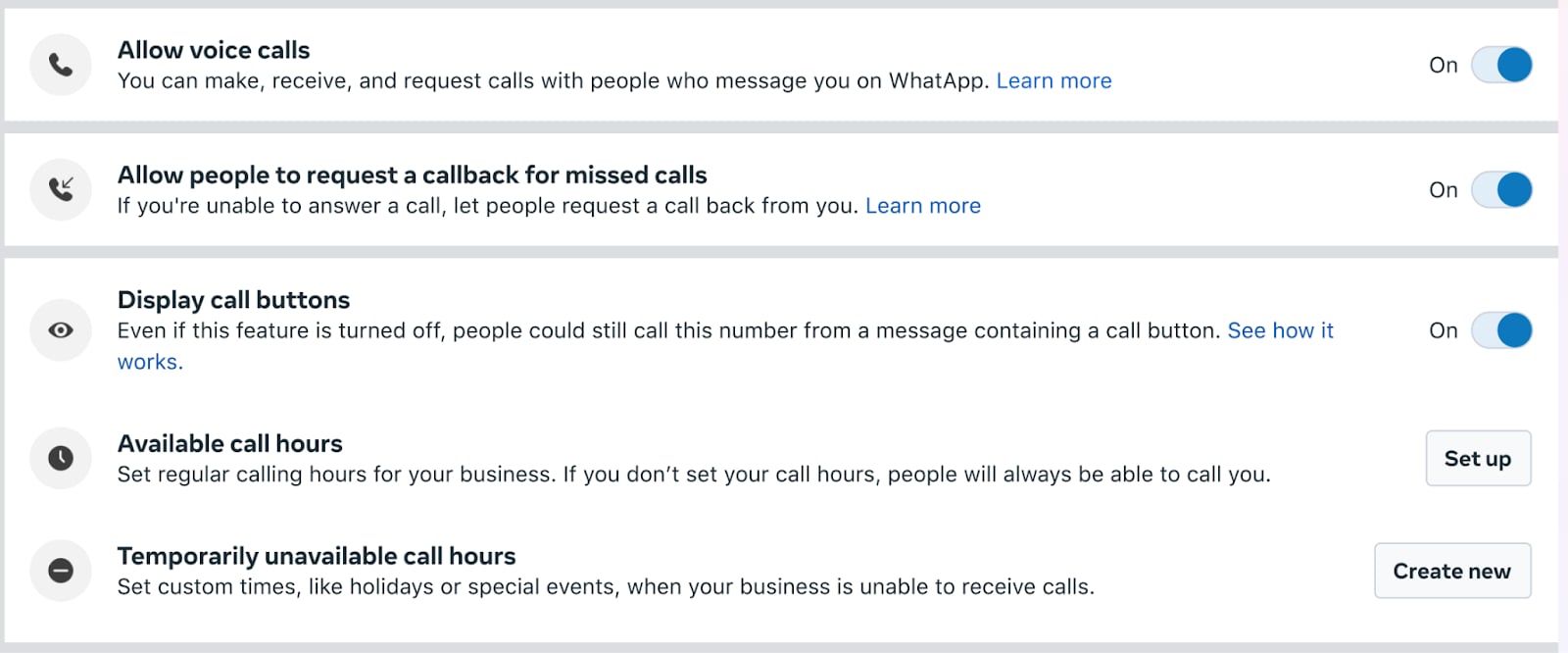 Enables the ability to make, receive, and request calls with users who message your WhatsApp number.
