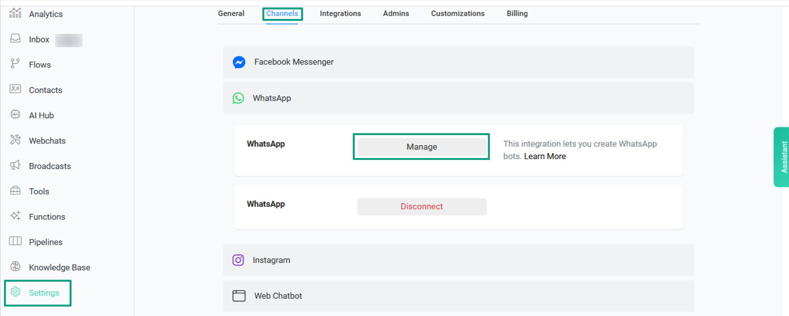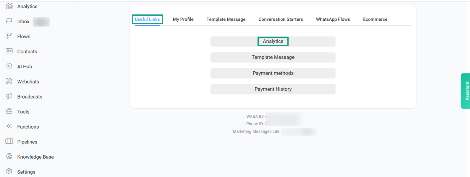 These options can be managed from Settings - Channels - WhatsApp - Manage - Useful Links - Analytics.