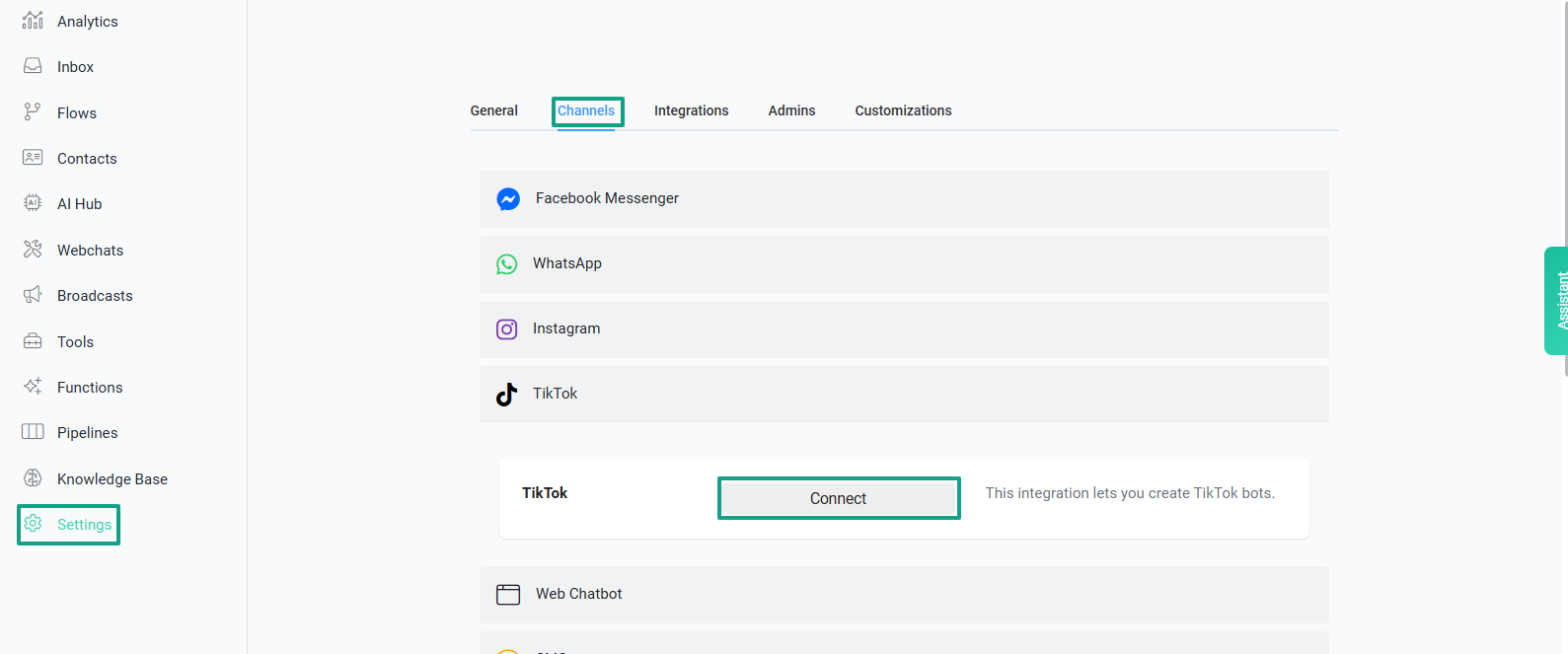 Step 1: Go to the side menu and select Settings → Channels → TikTok → Connect.