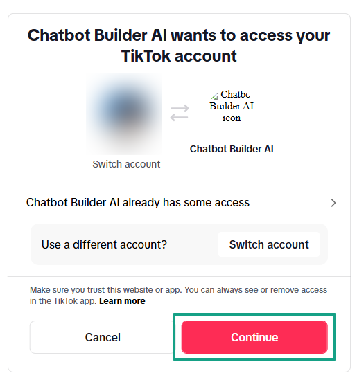 Step 2: Select the "Continue" button to authorize the connection between your TikTok business account and Chatbot Builder AI.
